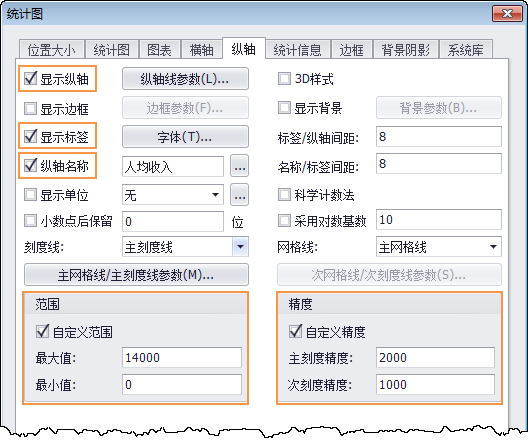 - 【纵轴】选项卡:即直方图的Y轴。当统计图类型非饼图时,该选项卡下的参数才有意义。