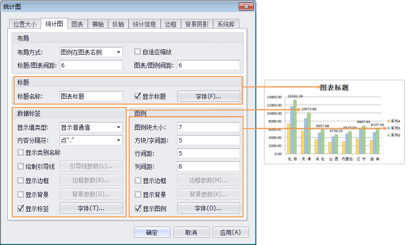 - 【统计图】选项卡:设置标题、数据标签、图例的参数。