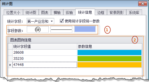 当勾选“使用统计字段统一参数”时,编号为①的区域的符号和颜色起作用;反之,则编号为②的区域的符号和颜色起作用。