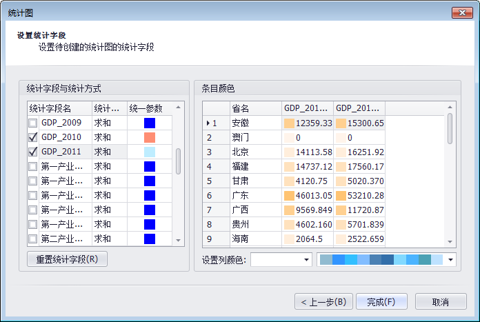 4. 在向导三对话框中,设置统计字段及统计方式,并选择图表条目的颜色,单击"完成",生成统计图。