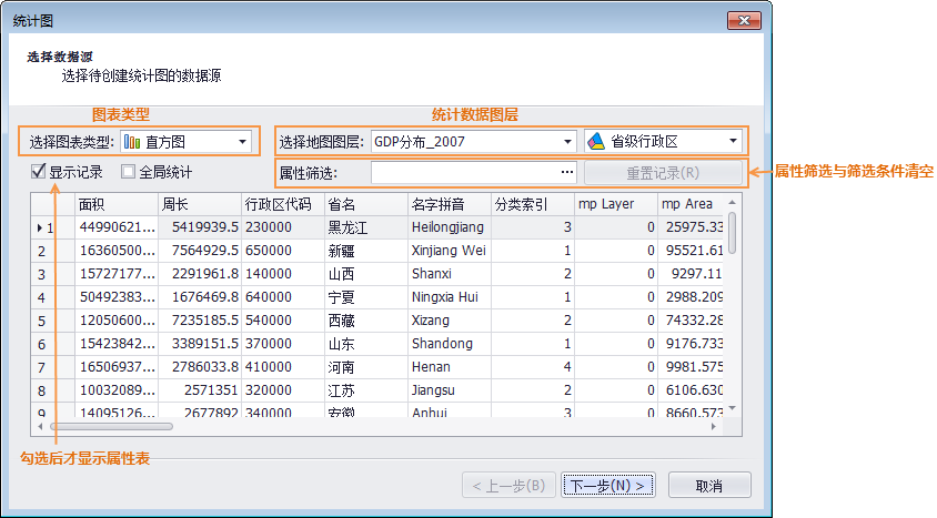 2. 在向导一对话框中,选择要生成统计图的图层数据,以及统计图图表类型。