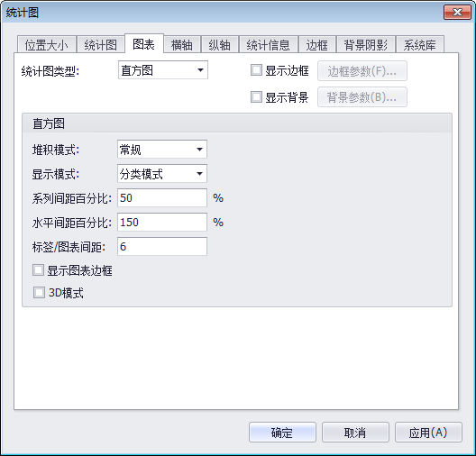 双击统计图,弹出属性设置对话框,提供了极其丰富的统计图编辑功能,包括间距、位置、颜色、布局等详细设置。下面介绍属性对话框中,主要的标签页内容: