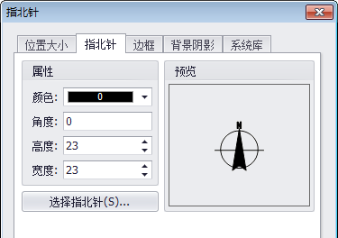 2. 双击指北针,弹出属性设置对话框,可以编辑颜色、角度、大小、样式、位置、边框等。其中“边框”、“背景阴影”参见“幅面设置”;