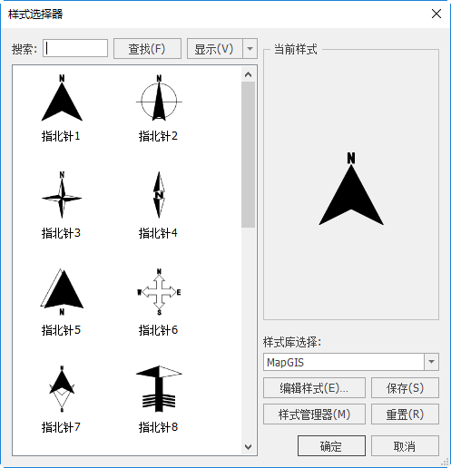 - 【重置】:点击该按钮可刷新“当前样式”窗口,使“当前样式”窗口中显示刚打开样式选择器时显示的指北针。