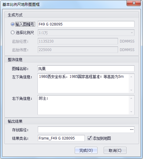 点击"工具",选择“生成图框”下的“基本比例尺地形图图框”,弹出下图对话框,根据实际情况设置相关参数,点击"完成"即可生成图框。