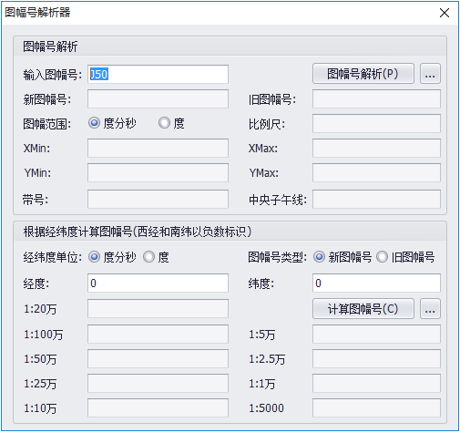 选择一种“经纬度单位”,根据选择的单位输入某点的“经度”、“纬度”值,然后选择“新图幅号”或“旧图幅号”,点击“计算图幅号”按钮,便可得到该点在各比例尺下的图幅号。