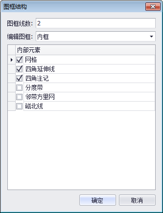 在“元素列表”中双击“图框”,可进行图框相关参数设置。点击“结构”,可在如下对话框中设置图框结构及元素类型。