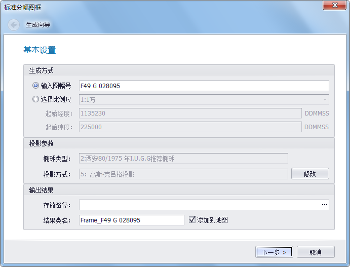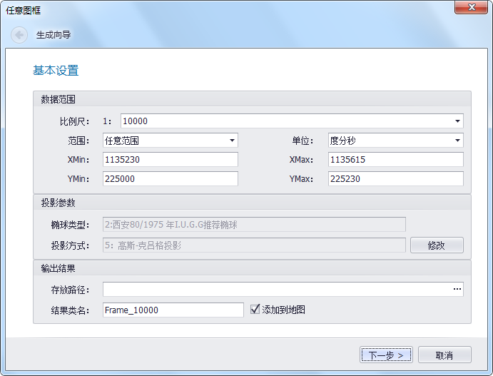 (3)输出结果:为生成的图框设置“存放路径”以及输入“结果类名”。若勾选“添加到地图”,则图框生成后将加载到“工作空间”下,更新视图区即可查看图框结果。