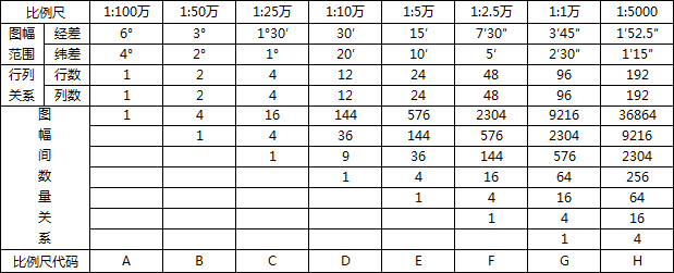 我国基本比例尺的地形图包括1:5000、1:1万、1:2.5万、1:5万、1:10万、1:25万、1:50万、1:100万共8种不同比例尺的图框。基本比例尺地图以经纬线分幅制作,它们以1:100万地图为基础,按规定的经差和纬差采用逐次加密划分方法划分图幅。这样不同比例尺的图幅将1:100万的图幅划分成若干行和列,使相邻比例尺地图的经纬差、行列数和图幅数成简单的倍数,如下表所示。