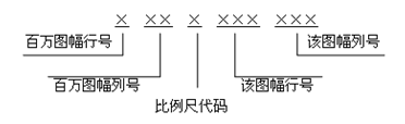 1:50万~1:5000地图的编号以1:100万地形图编号为基础,采用行列编号方法,即将1:100万地形图按所含各比例尺地形图的经差和纬差划分成若干行和列,横行从上到下、纵列从左到右按顺序分别用阿拉伯数字(数字码)编号,这样便于计算机运算处理。表示图幅编号的行、列代码均采用3位数字表示,不足3位时前面补0,取行号在前、列号在后的排列形式标记,加在1:100万图幅的图号之后。为了使各种比例尺不至混淆,分别采用不同的字符作为各种比例尺的代码,如上表所示。每幅图的编号是由该图幅所在的1:100万地图编号、比例尺代码以及各自图幅所在的行号和列号的数字码组成,其表达格式为: