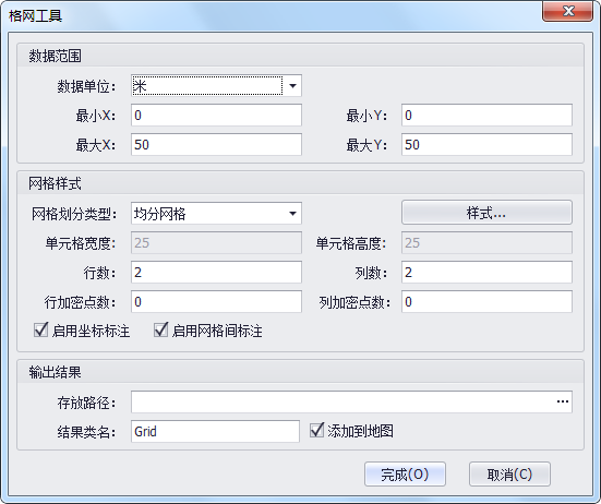 - 【输出结果】:设置网格存放路径和图层名称,勾选“添加到地图”后,生成的网格会自动显示到工作空间。