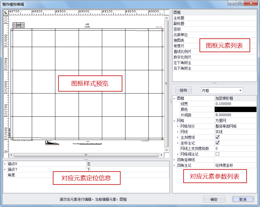 在“图框元素列表”中的任意一项元素,左边“图框样式预览”框中将放大并闪烁显示该元素,同时“对应元素参数列表”中将显示该元素的相关参数,用户可在该参数列表中通过修改各参数值来调整对应元素样式,同时“对应元素定位信息”中可对该元素的位置进行设置。