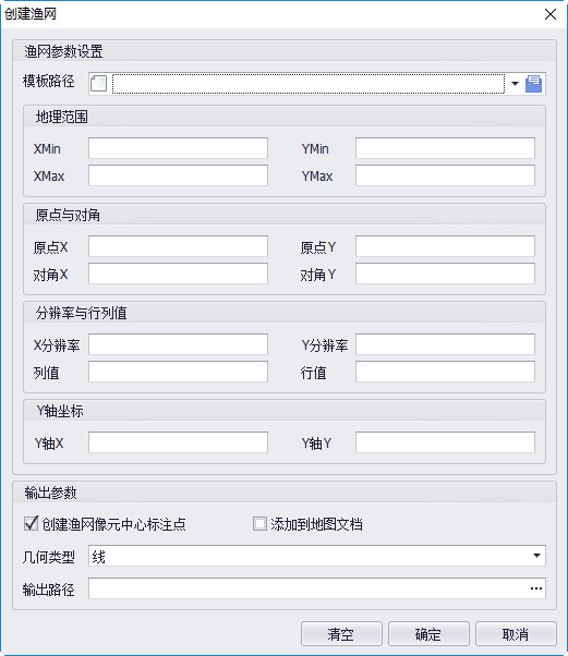 渔网的坐标优先以模板数据为准;当没有模板数据时,根据地理范围XY确定;两者都没有时,根据原点XY计算范围。