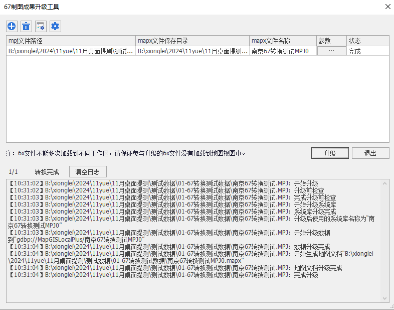 1. 在MapGIS中工具-启动功能67制图成果升级,在弹出的升级工具对话框中,选择MapGIS67地图文档.mpj,设置目的数据保存路径等信息:
