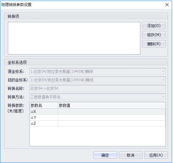 1. 在地理转换参数设置窗口点击"添加"打开添加地理转换项窗口