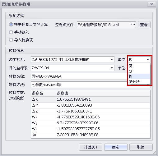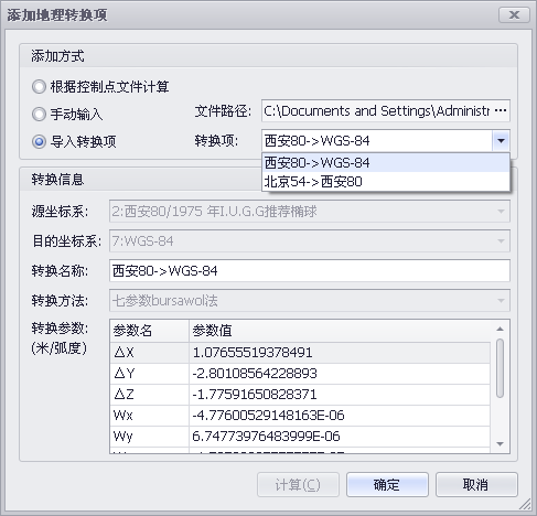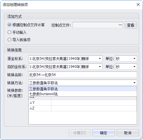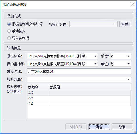 (1)添加方式:用户可选择不同的方式来计算“转换参数列表(米/弧度)”中的参数值: