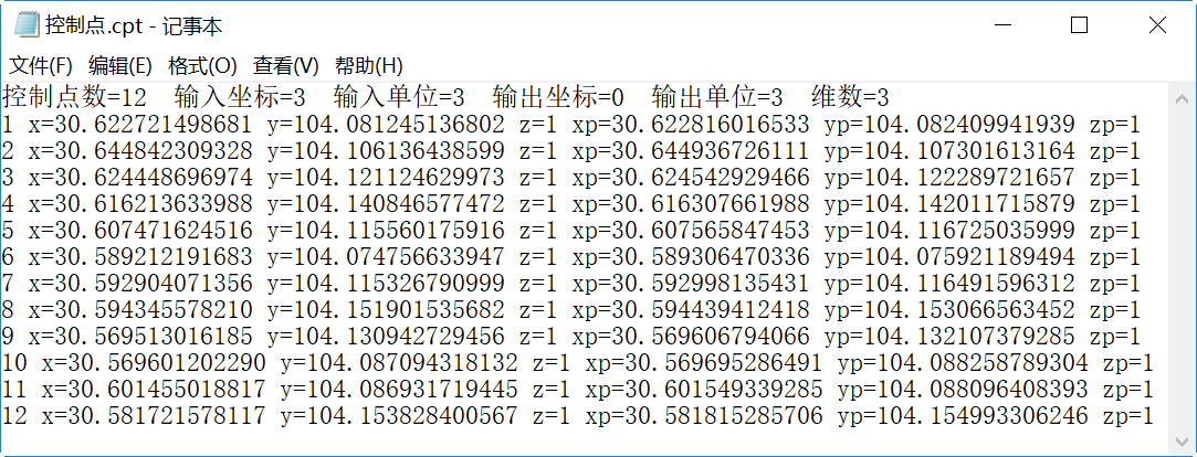 控制点文件(*.cpt)记录了用于计算转换参数的控制点信息,