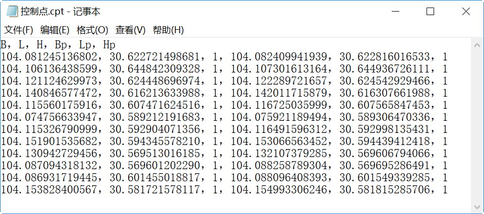 文本第一行为标题栏,格式统一为:B,L,H,Bp,Lp,Hp。分别代表原控制点经度、原控制点纬度、原控制点高程、参考控制点经度、参考控制点纬度、参考控制点高程六个值。