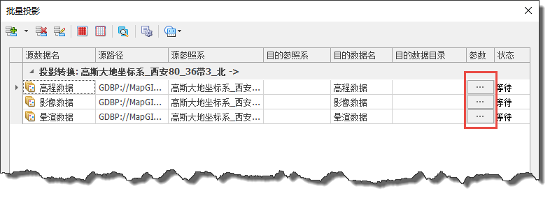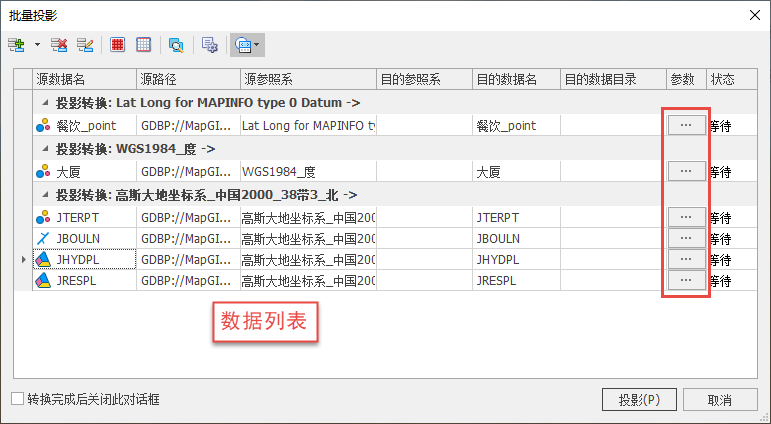 其中,“参数”这一项(上图红色框选部分)只能在数据列表中进行设置(用于不同椭球内的投影转换),具体设置可参考“地理转换参数设置”。