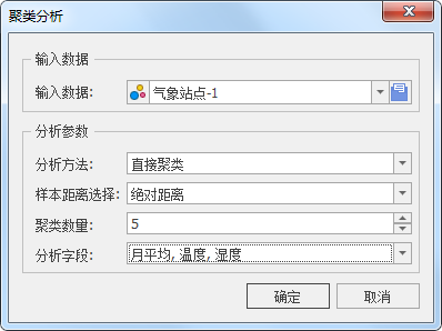 1. 在分析选项卡中,点击“统计分析”按钮,选择 “聚类分析”命令,弹出聚类分析对话框,以气象数据聚类分析为例,如下图所示。