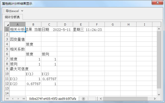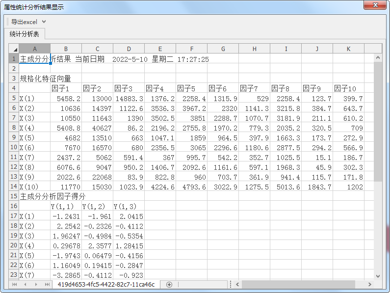 3. 点击"确定"按钮,执行主成分析后显示统计分析表,系统支持导出表格,如下图所示。