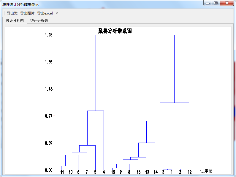 3. 点击"确定"按钮,执行聚类分析,系统按照所设属性统计参数绘制并显示聚类谱系图和统计分析表。如下图所示,同时系统提供成果导出功能,支持要素类、图片和表格方式导出。