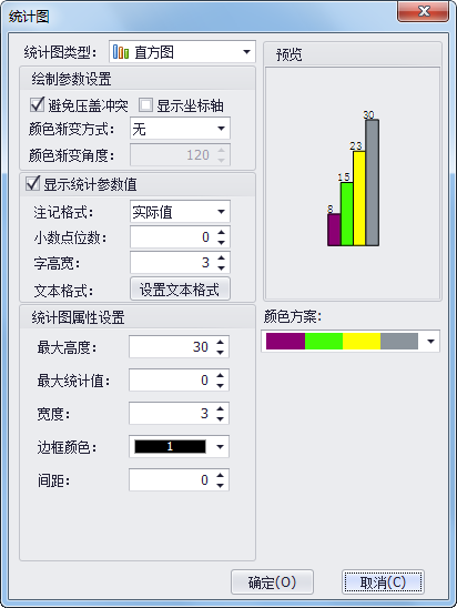 “样式库管理器”左侧选择“统计图”节点,在右侧窗口中,【右键】选择“新建”或“属性”命令项,或双击某统计图,弹出下图所示统计图编辑对话框: