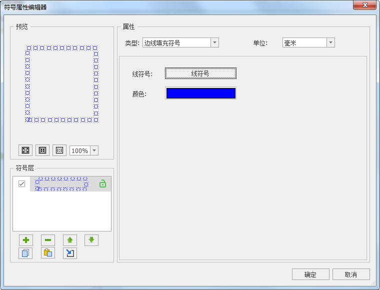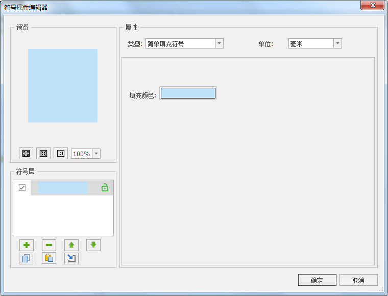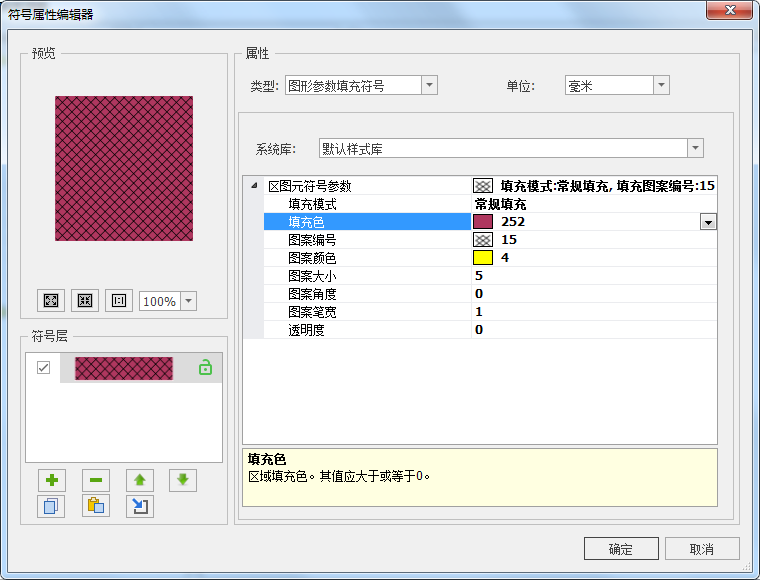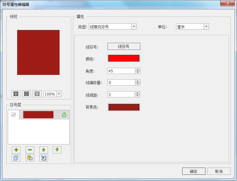 - 【符号层】:设置面填充符号的结构信息。通过“添加”、“删除”操作,修改面填充符号层数;通过“上移”、“下移”操作,改变面填充符号图层顺序;“复制”、“粘贴”或“导入”修改面填充符号某层样式。