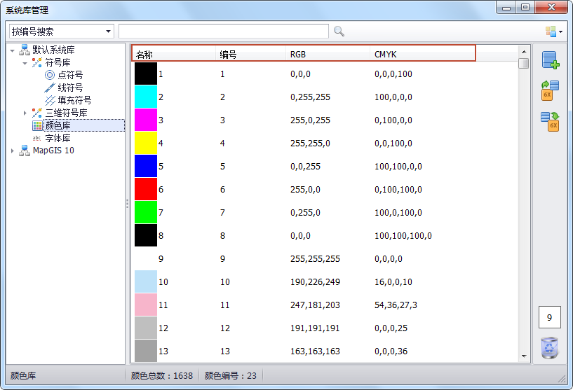 MapGIS中使用的所有颜色来自于颜色库。颜色库中包含各种颜色,每种颜色有名称、编号、RGB、CMYK四个属性。可以在“搜索栏”按编号、RGB、CMYK进行搜索。