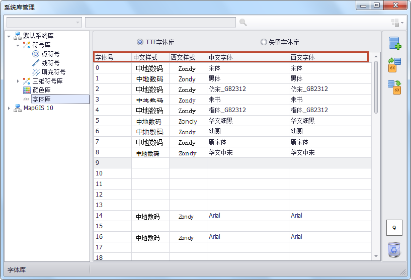 在“系统库管理”对话框左侧窗口,选择某一系统库下“字体库”,数据视窗中将显示库中所有字体符号。字体库包括TTF字体库和矢量字体库;若该系统库文件夹下包含矢量字体库的文件则可选择“矢量字体库”进行查看。