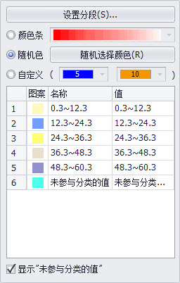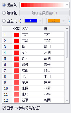 - 【自定义】:若选择“自定义”模式设置颜色,首先点击括号中第一个颜色块旁的下拉键,选择起始颜色,然后点击第二个色块的下拉键选择终止色,系统将从起始色渐变到终止色依次显示专题图中各数据类型。