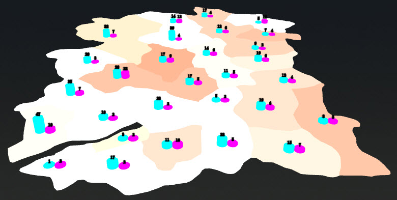 三维统一专题图的效果图如下所示,从上到下依次是点、线、区的三维统一专题图: