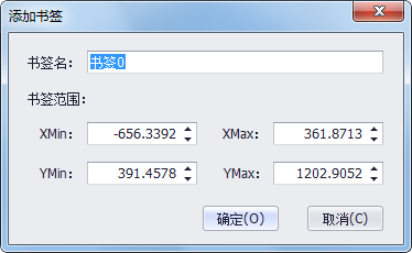 点击“书签”菜单,选择“添加书签(交互)”,用鼠标在视图区拉框选择需要做成书签的内容,拉框完成后同样弹出“添加书签”对话框,只是此时“书签范围”下显示的是拉框范围,点击“确认”按钮,书签添加完成。