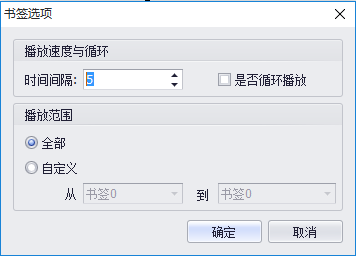 “停止”按钮则停止播放;点击“播放设置”按钮弹出右下图所示的对话框,【时间间隔】可设置播放时书签跳转的时间间隔,【是否循环播放】勾选后可循环播放所有书签,【播放范围】可选择播放哪一部分书签。