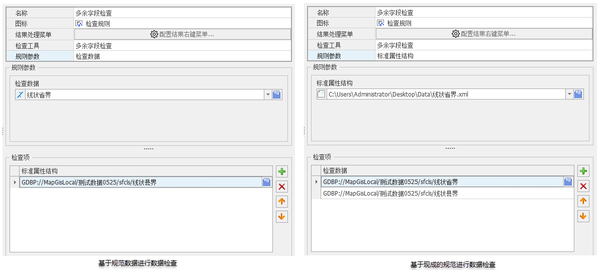 - 【规则参数】:选择检查的规则信息,多余字段检查支持两种检查方式,一种是已有现成的标准属性结构(*.xml)时,可以选择属性结构与数据比对检查;一种是有现成属性结构正确的数据,可以通过读取标准属性结构的数据,与其进行比对检查,两种操作界面如下: