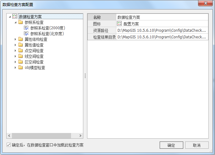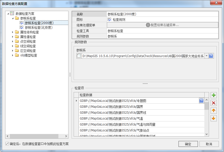 1. 在数据检查面板上,点击“配置检查规则”按钮,打开数据检查方案配置对话框,在检查方案目录树中,展开并选择正确的参照系检查项,如下图所示: