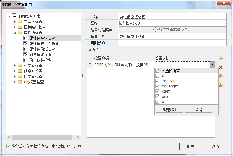 1. 在数据检查方案配置对话框中,展开检查方案目录树中属性值检查组,分别对属性值检查项进行配置。