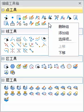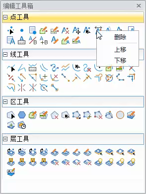 将常用的点、线、区、层编辑工具放置在此工具箱中,协助用户更方便的操作地图。使用方法与对应的菜单项和工具条项相同。