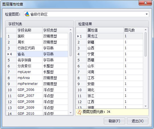 3. 在“检查图层”下拉框中选择查看的图层,点击“字段列表”下任一字段,右侧“检查结果”列表中将显示该字段下所有的属性值;