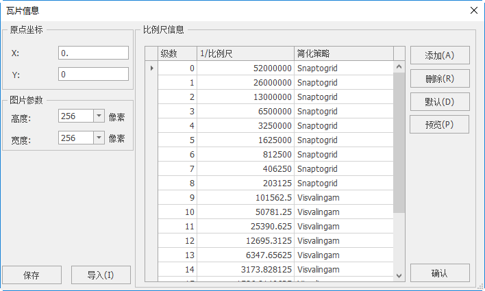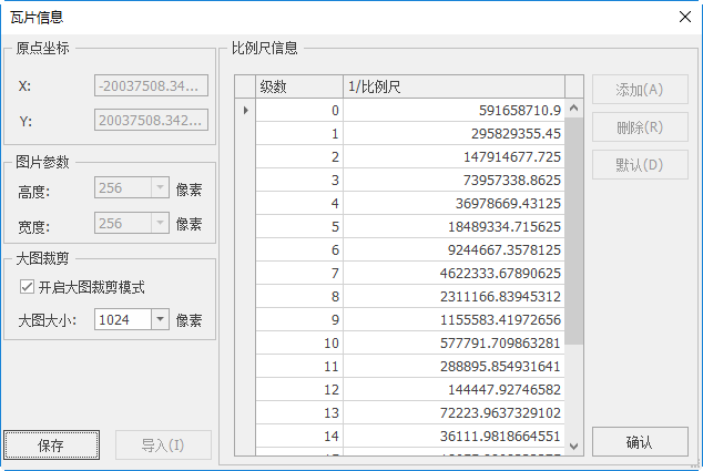 - 添加:可以添加瓦片级数,同时系统会以上一级比例尺的2倍的比例计算出新比例尺。同时,用户在比例尺栏中点击比例尺,也可以手动输入新的比例尺;