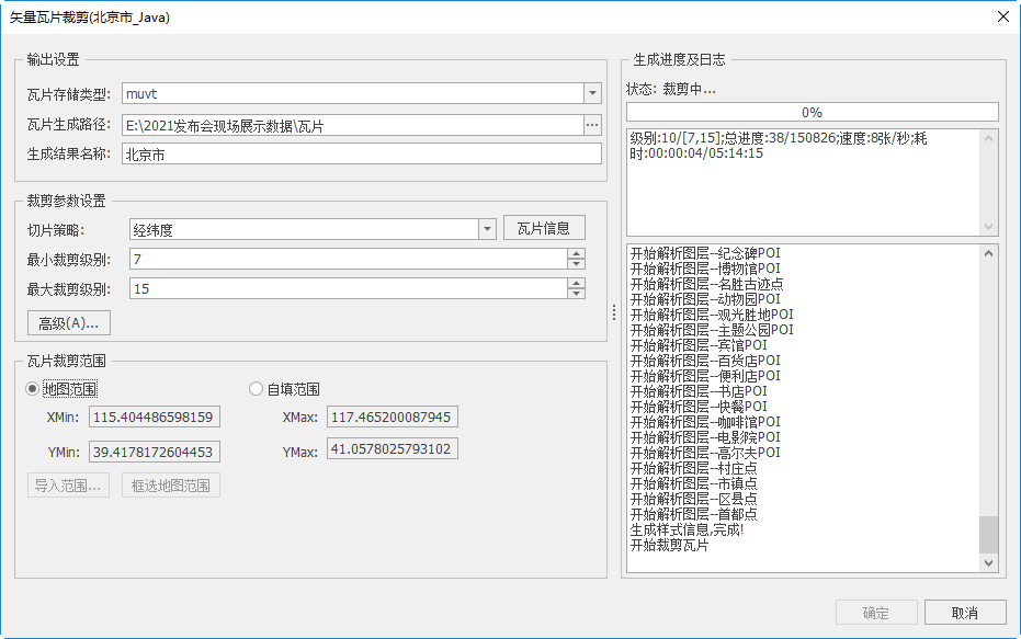 5. 点击"确定",开始执行矢量瓦片裁剪。