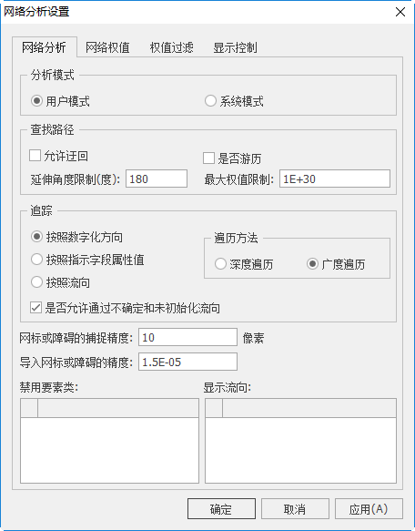 选择"网路分析"选项卡,可以设置路径查找的方式(允许迂回、是否游历)、追踪方式以及精度设置。