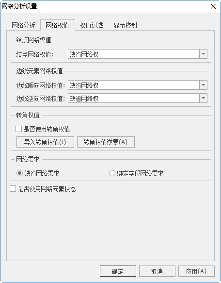 在“网络权值”选项卡中的下拉框内,除了缺省网络权外,其他项都是在创建网络类是所设置的权值名称。(缺省网络权可以在“网络分析”菜单-》“元素信息”-》“网络元素信息”对话框中进行设置)