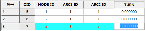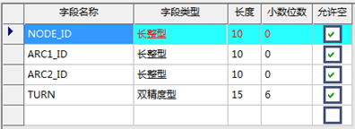 设置权值表的属性结构如图所示。NODE_ID—转角结点、ARC1_ID—起始边、ARC2_ID—终止边、TURN—转角权值。权值表属性结构设置如下:
