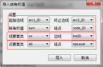 其中,起始边线、终止边线、转角权值、结点分别选择权值表中对应的字段。