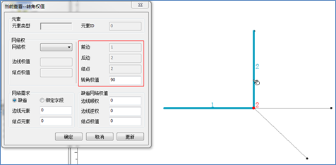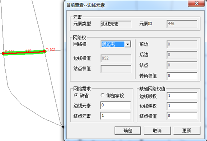 (5)查看转角权值。导入后,可使用网络元素查看工具,查看权转角值。点击“网络元素信息”按钮,选择“点选转角按钮”,鼠标变为手型,在网络中,先点击选择一条起始边线,再选择终止边线,在对话框中即会显示出转角的信息,包括前边、后边、节点和转角权值。