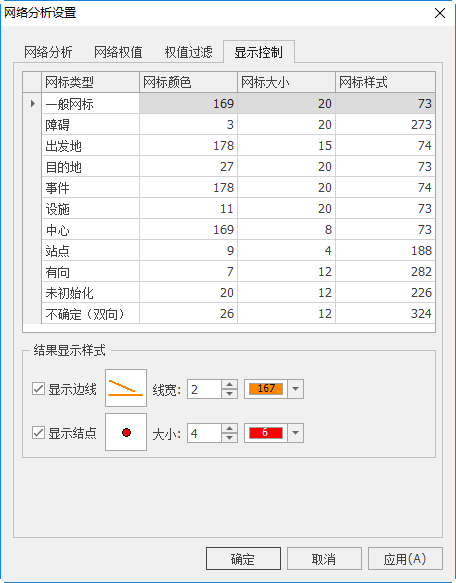 显示结点:设置用来定义网络分析结果的显示样式,勾选表示显示结点,不勾选表示不显示