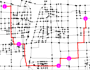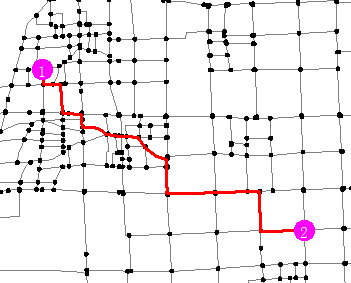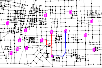 6. 点击"分析"按钮进行最佳路径分析,则在几何图形网络上会以突出颜色标识出分析结果。