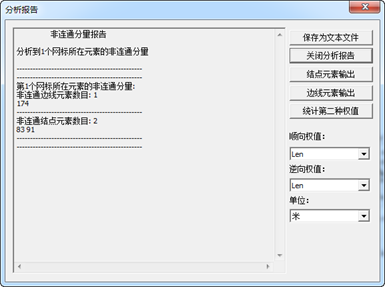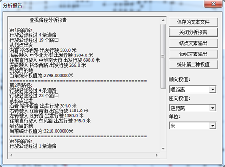 - 查看分析报告 :点击"网络分析"->"网络分析报告",弹出分析报告设置对话框,可以设置权值统计、道路名称、单位等参数。单击确定后,弹出分析报告对话框,记录了路径的具体分析报告。点击分析报告右边的按钮“统计第二种权值”,在分析报告中显示路径第2权值统计报告。同时,可以将分析报告保存为文本文件,还可以输出结点和边线元素为简单要素类。