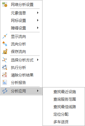 网络分析模块提供了大量的工具来完成常见的网络分析任务,通常用来处理资源分配、定位分配、最近设施、多车送货、查询连接信息、追踪分析和流向分析等问题。通过网络分析工具条上的各种工具可以完成这些分析与应用,包括网络分析设置、设置网标、障碍、多种分析方式、分析报告等工具。
